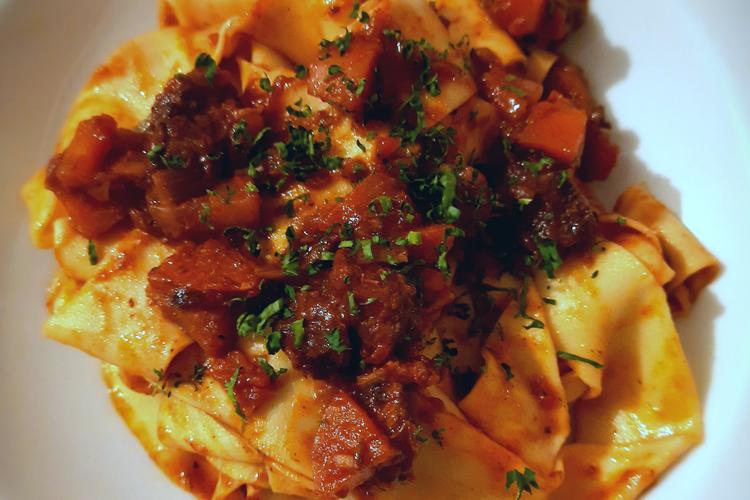 Selbstgemachte Pappardelle al Cinghiale (Bandnudeln in Wildschweinragout)