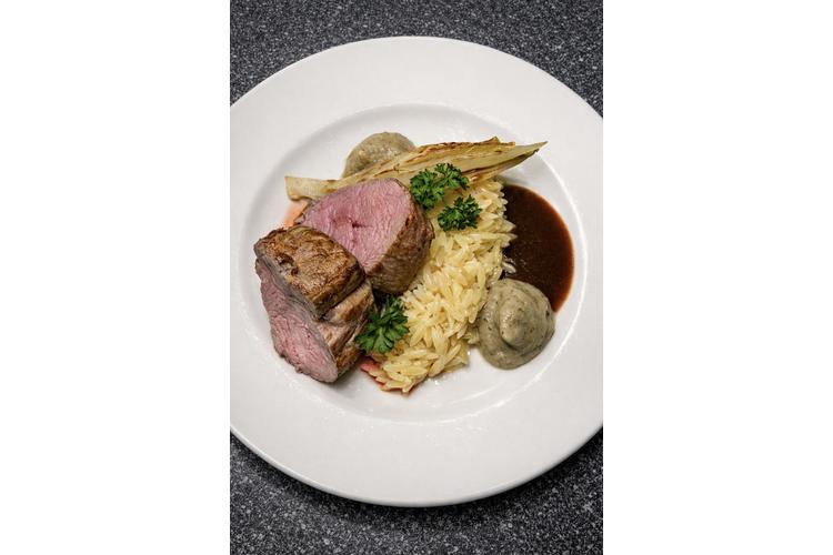 Lachs Tatar oder gebraten, mit Gurke zweierlei eröffnet den Abend, gefolgt von Lammkarree auf cremigem Orzo-Risotto, Aub...